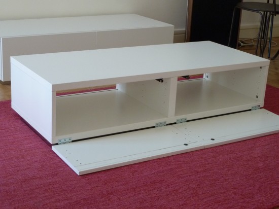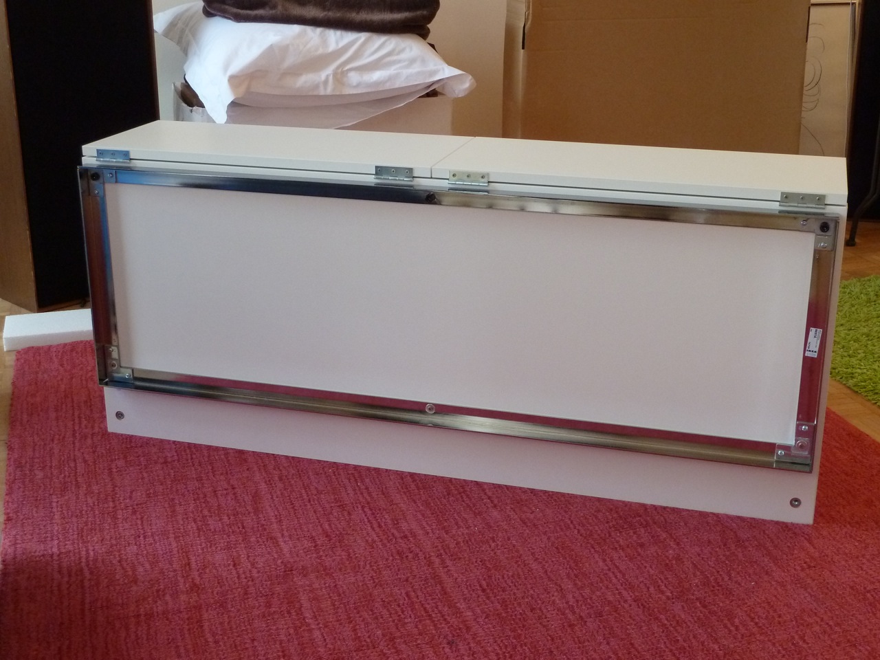 L’idée est de hacker un Besta banc de IKEA. Ce meuble est ultra simple et peu cher (49€). Il présente l’avantage d’avoir pas mal de hauteur intérieure (19cm) et une bonne profondeur (49cm) pour loger les éléments les plus encombrants comme le vidéo projecteur ou un ampli HC par exemple. Par contre, l’inconvénient majeur est que ce meuble n’a pas de portes par défaut. IKEA propose bien des tiroirs mais cela ne répond pas du tout à mon besoin. Autre ennui, les pieds qu’on peut ajouter à ce meuble ne me plaisent pas vraiment. Pour réaliser mon meuble, j’ai donc contourné ces inconvénients en ajoutant des portes et un pied en acier chromé.